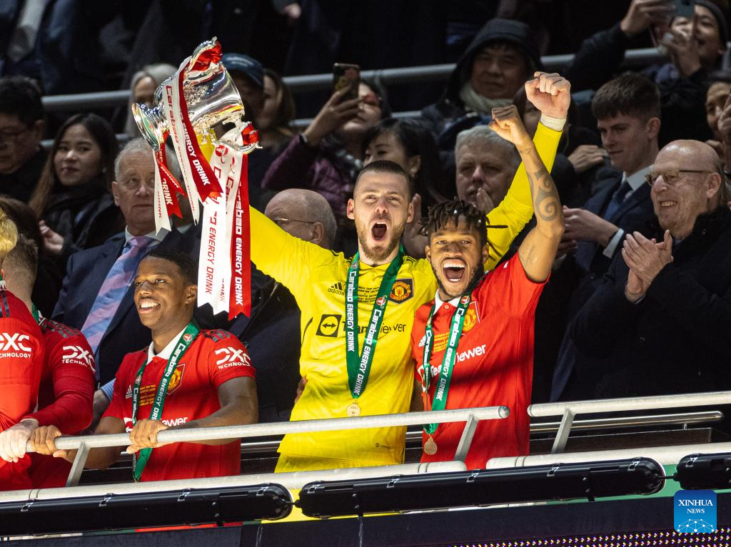 Manchester United's goalkeeper David de Gea (front, 2nd R) and player Fred (front, 1st R) celebrate during the awarding ceremony for the Football League Cup Final match between Manchester United and Newcastle United in London, Britain, on Feb. 26, 2023. (Xinhua)