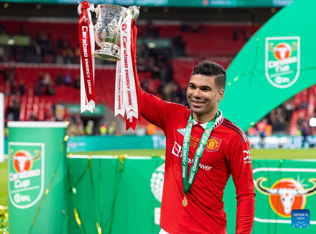 Manchester United's Casemiro celebrates with the trophy after the awarding ceremony for the Football League Cup Final match between Manchester United and Newcastle United in London, Britain, on Feb. 26, 2023. (Xinhua)