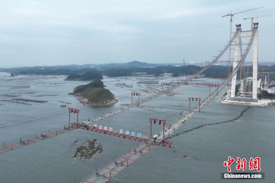 Aerial view shows the Longmen Bridge is under construction in Qinzhou, south China's Guangxi Zhuang Autonomous Region, Feb. 24, 2023. (Photo: China News Service/Wang Ronghua)