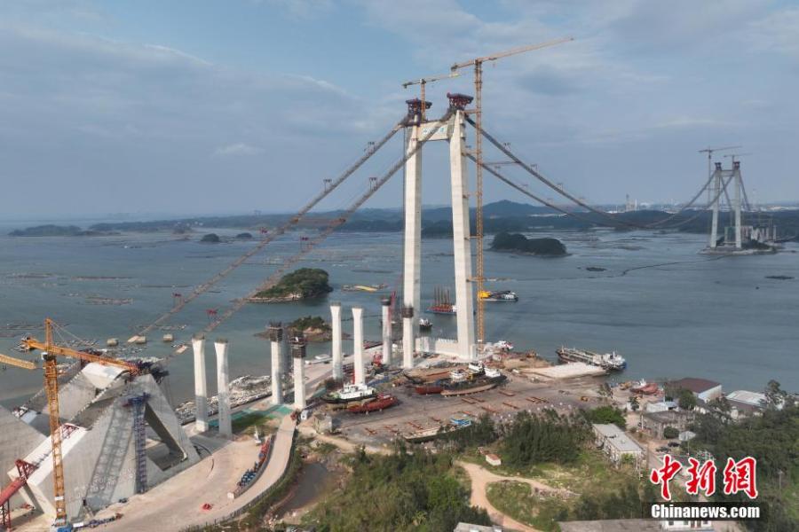 Aerial view shows the Longmen Bridge is under construction in Qinzhou, south China's Guangxi Zhuang Autonomous Region, Feb. 24, 2023. (Photo: China News Service/Wang Ronghua)