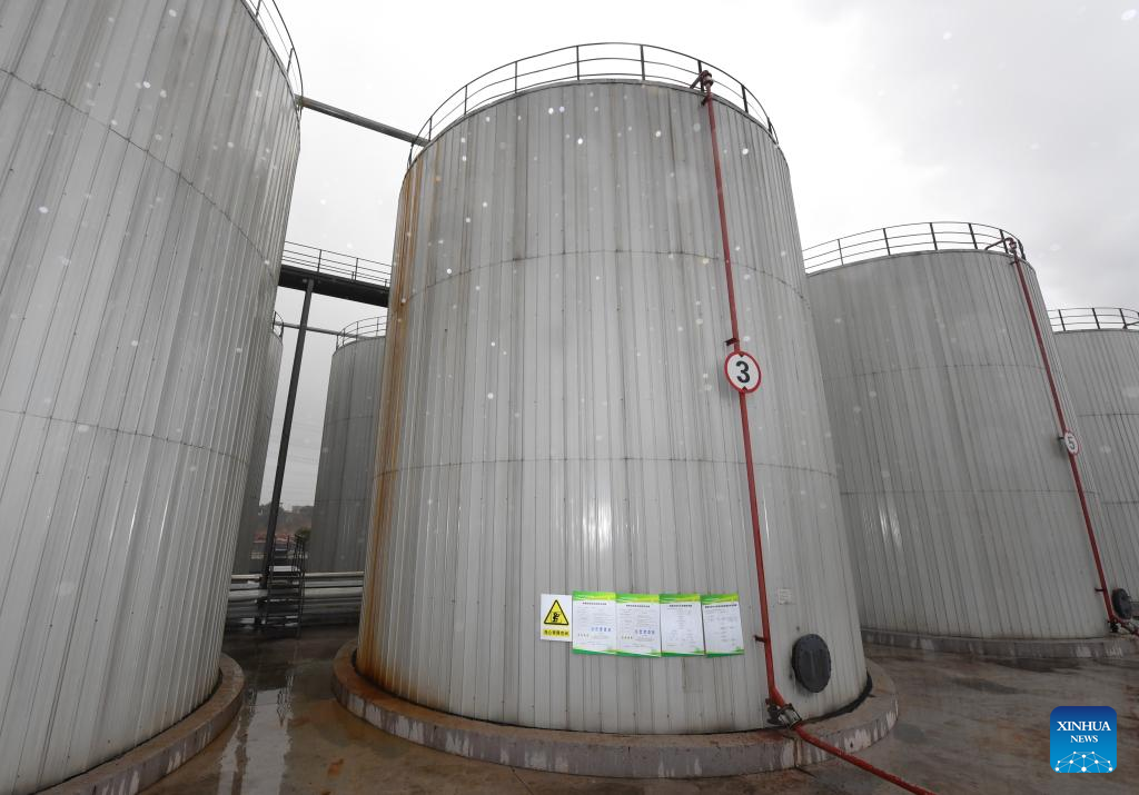 This photo taken on Feb. 21, 2023 shows oil storage tanks at an environmental protection tech company in southwest China's Sichuan Province. About 400 tons of waste oil is made each day by local catering service industry in Chengdu, among which 70 to 80 percent would be transported to environmental protection tech companies in Sichuan and recycled into products. (Xinhua/Liu Kun)