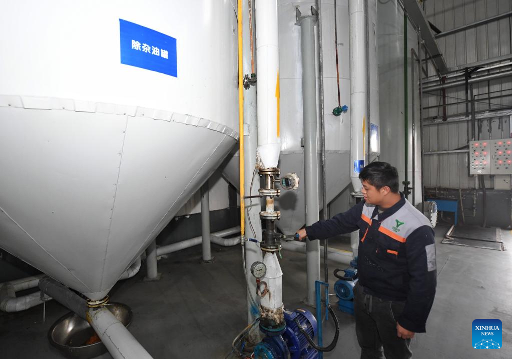 A worker operates equipment on the production line of an environmental protection tech company in southwest China's Sichuan Province, Feb. 21, 2023. About 400 tons of waste oil is made each day by local catering service industry in Chengdu, among which 70 to 80 percent would be transported to environmental protection tech companies in Sichuan and recycled into products. (Xinhua/Liu Kun)