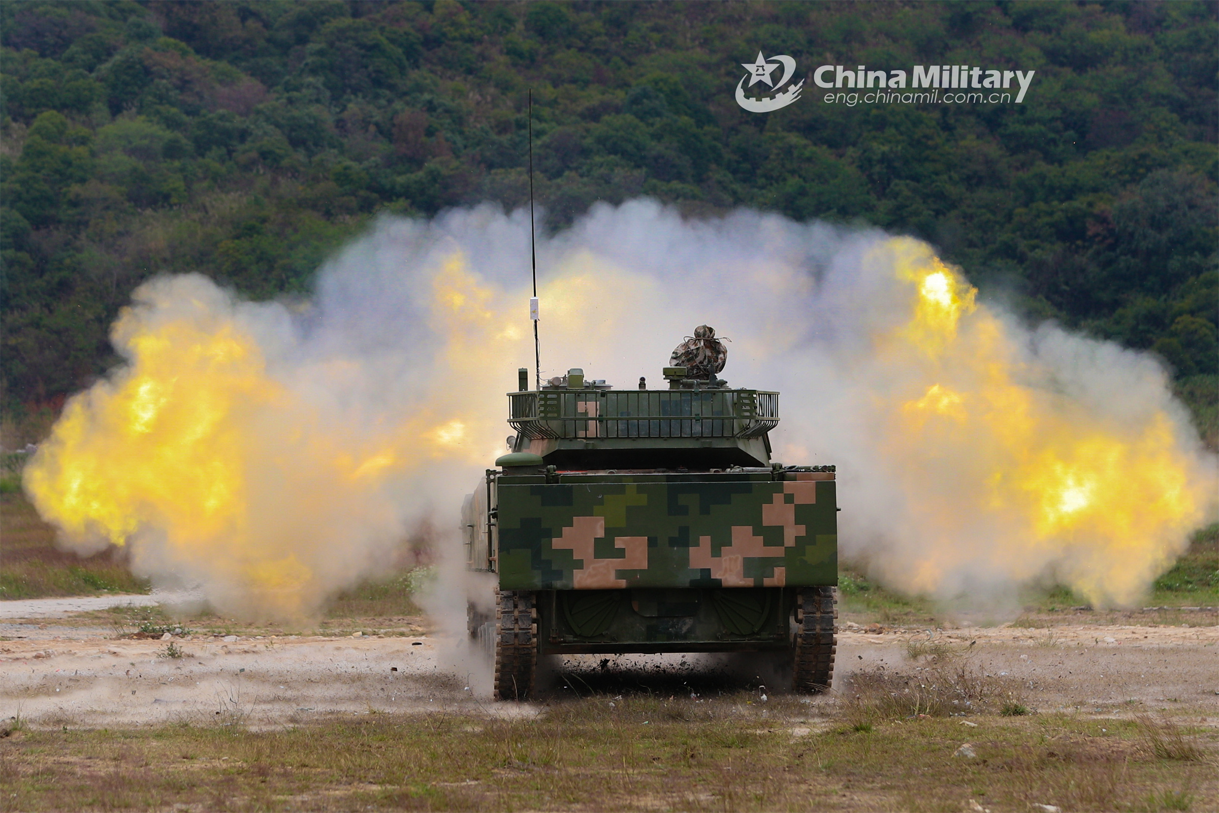 An amphibious armored assault vehicle attached to the PLA 74th Group Army spits fire at simulated target during a recent live-fire training exercise. (eng.chinamil.com.cn/Photo by Li Bin)