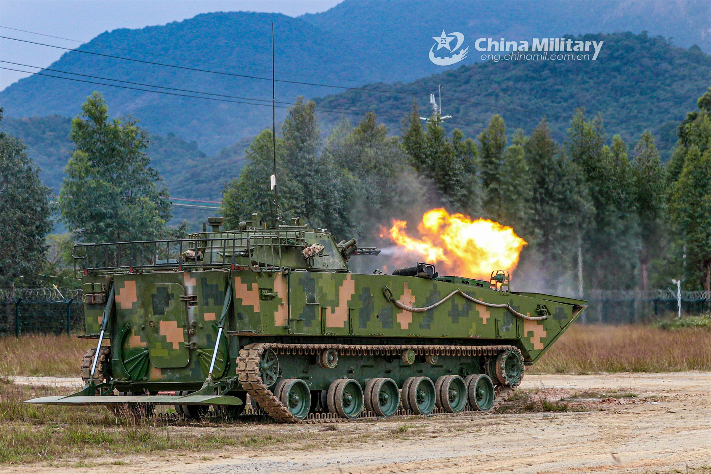 An amphibious infantry fighting vehicle attached to the PLA 74th Group Army spits fire at simulated target during a recent live-fire training exercise. (eng.chinamil.com.cn/Photo by Li Bin)
