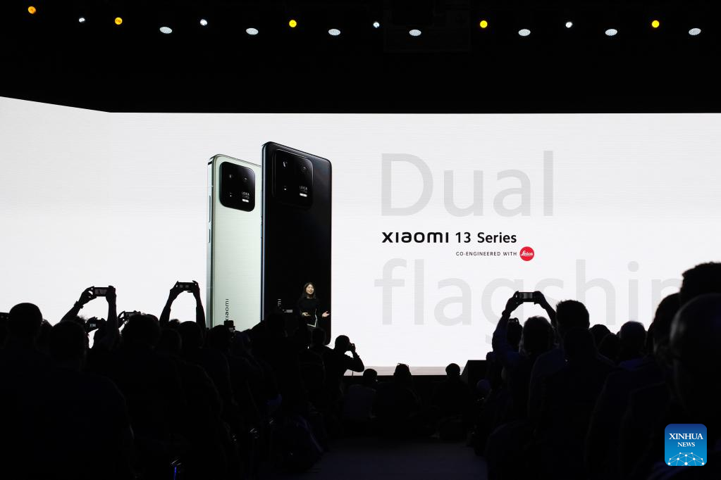 This photo taken on Feb. 26, 2023 shows the new products launch event of Chinese tech firm Xiaomi in Barcelona, Spain. Several products, including new smartphones, were released during the launch event of Xiaomi in Barcelona international convention center on Sunday. (Xinhua/Meng Dingbo)