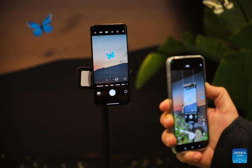 A visitor tries the newly released smartphone of Chinese tech firm Xiaomi during its new products launch event in Barcelona, Spain, Feb. 26, 2023. Several products, including new smartphones, were released during the launch event of Xiaomi in Barcelona international convention center on Sunday. (Xinhua/Meng Dingbo)