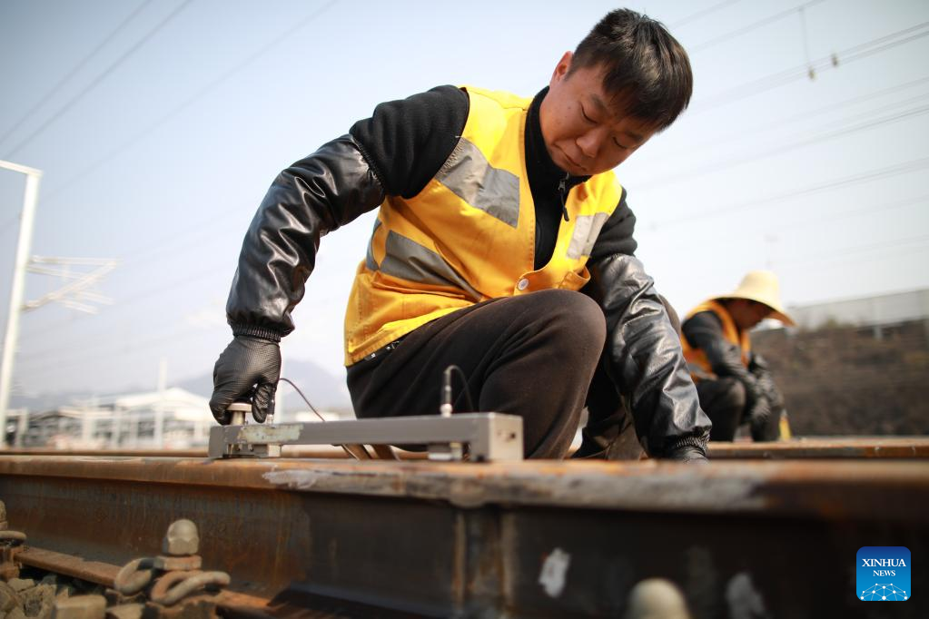 A technician uses a flaw detector to detect rail track near the Duyun East Railway Station along Guiyang-Nanning high-speed railway in Duyun, southwest China's Guizhou Province, Feb. 27, 2023. The Guiyang-Nanning high-speed railway, with a maximum speed of 350 km per hour, is expected to go into service in 2023. (Xinhua/Liu Xu)