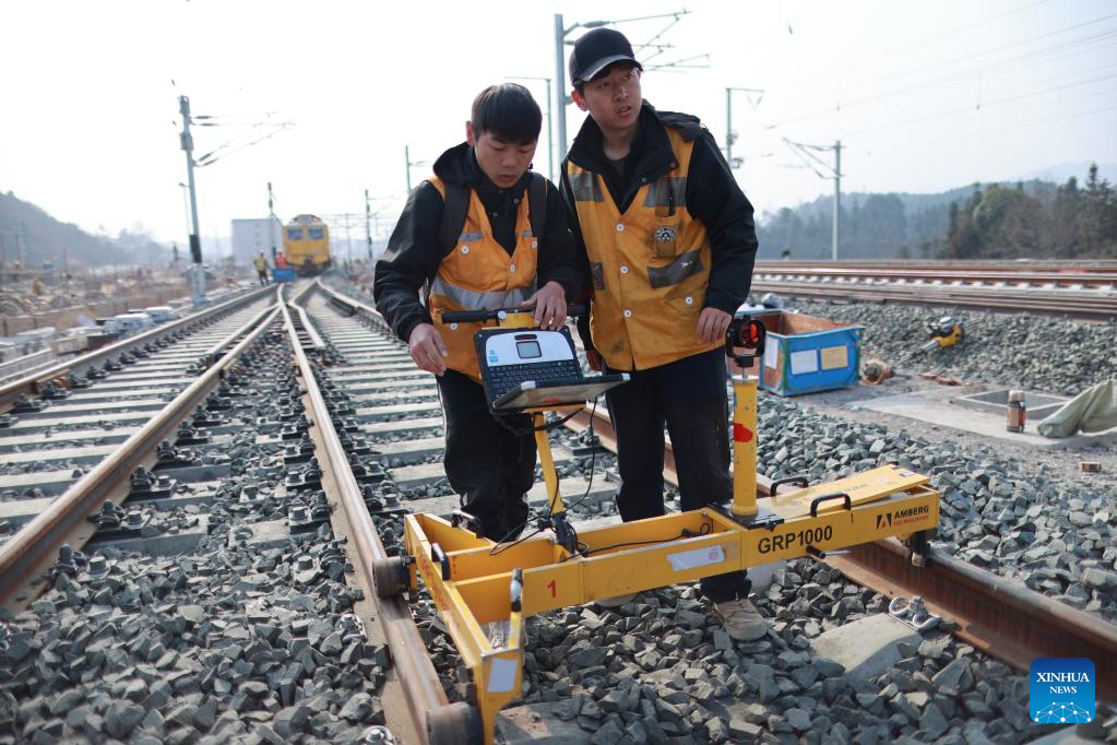 Technicians use a gauging apparatus to check the rail track near the Duyun East Railway Station along Guiyang-Nanning high-speed railway in Duyun, southwest China's Guizhou Province, Feb. 27, 2023. The Guiyang-Nanning high-speed railway, with a maximum speed of 350 km per hour, is expected to go into service in 2023. (Xinhua/Liu Xu)