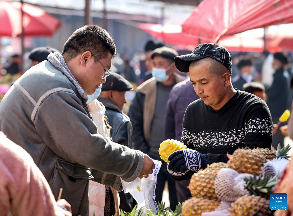 A customer buys pineapples at a weekly bazaar in Tokkuzak Township of Shufu County, northwest China's Xinjiang Uygur Autonomous Region, Feb. 26, 2023. (Xinhua/Ma Kai)
