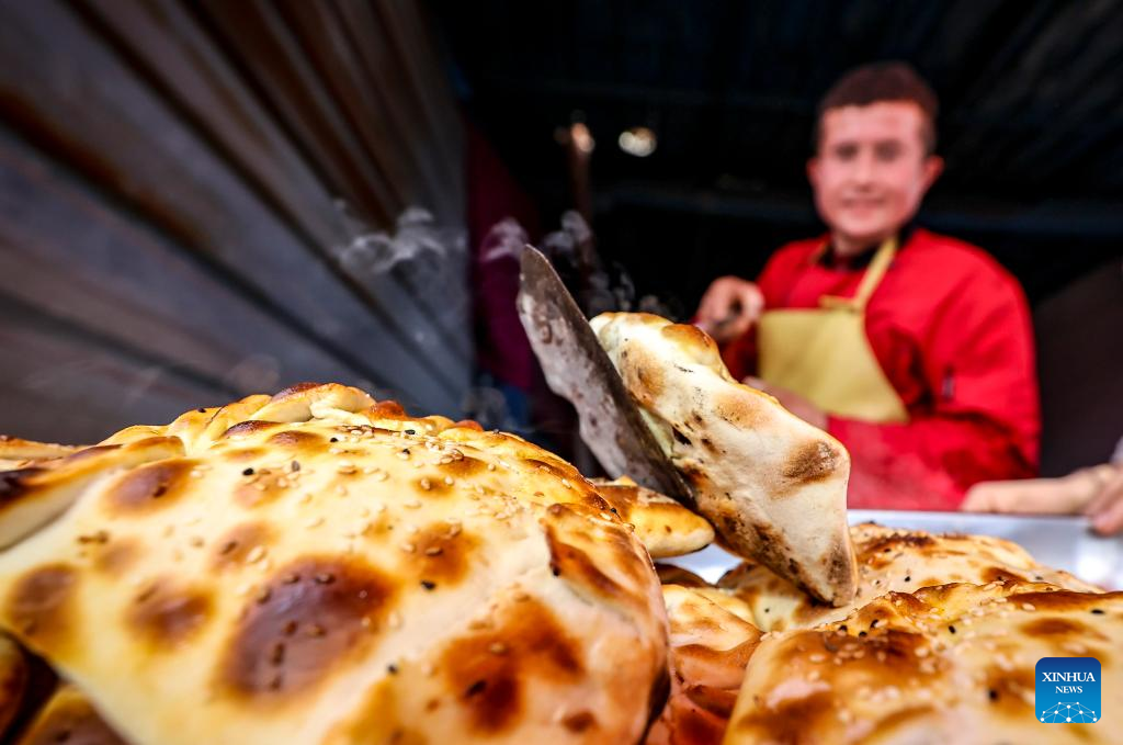 A vendor makes traditional food at a weekly bazaar in Tokkuzak Township of Shufu County, northwest China's Xinjiang Uygur Autonomous Region, Feb. 26, 2023. (Xinhua/Ma Kai)