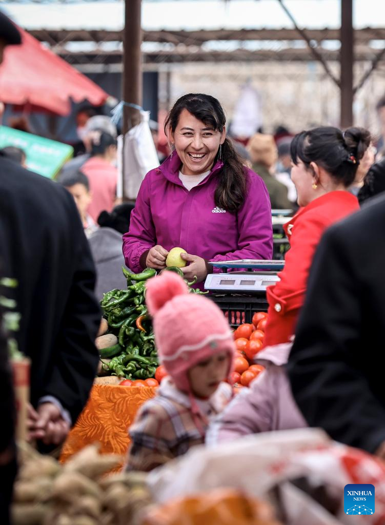 People talk at a weekly bazaar in Tokkuzak Township of Shufu County, northwest China's Xinjiang Uygur Autonomous Region, Feb. 26, 2023. (Xinhua/Ma Kai)