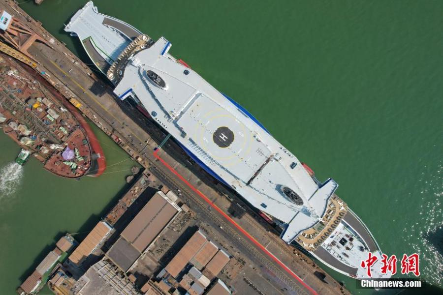 The world's first large-capacity battery hybrid propulsion and two-way navigation ro-ro passenger ship is delivered in Guangzhou, south China's Guangdong Province, Feb. 28, 2023. (Photo: China News Service/Chen Jimin)