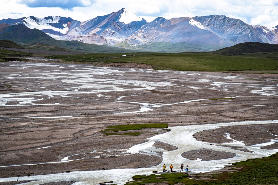 This aerial photo taken on July 26, 2022 shows members of a scientific expedition team of the Changjiang River Scientific Research Institute working at the headwater region of the Yangtze River in northwest China's Qinghai Province. (Xinhua/Xiao Yijiu)
