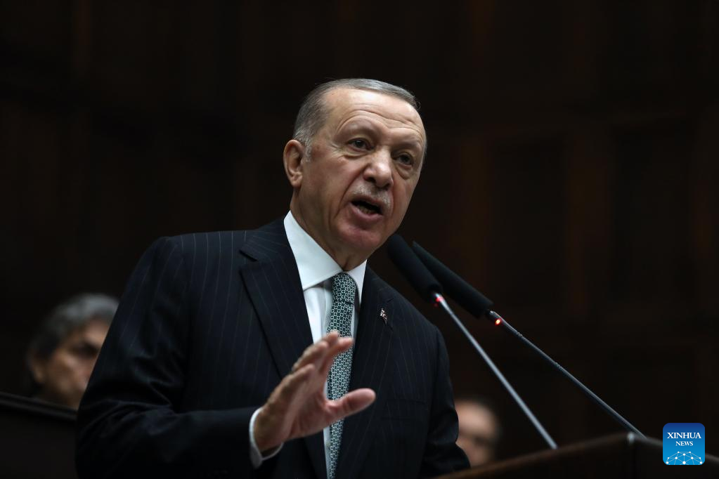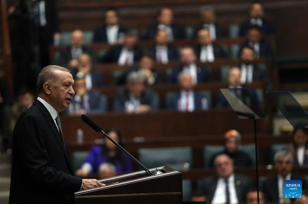 Turkish President Recep Tayyip Erdogan addresses a group meeting of the Justice and Development Party in Ankara, Trkiye, March 1, 2023. Erdogan announced on Wednesday that his government plans to hold the presidential and parliamentary elections on May 14, as the country is still recovering from two devastating earthquakes that struck a large swathe of its southern region in early February. (Photo by Mustafa Kaya/Xinhua)
