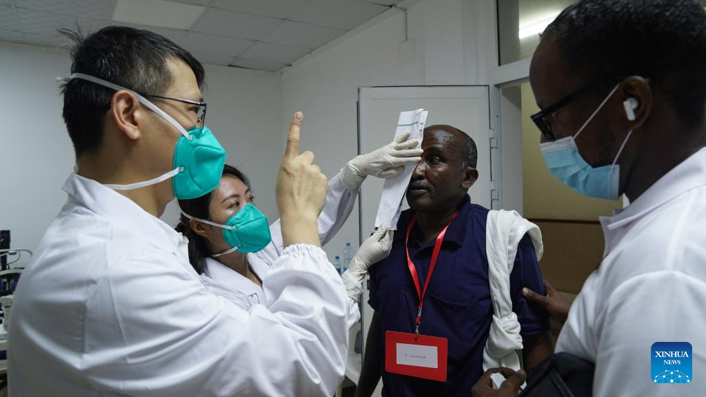 A member of a Chinese medical team performs eye checkup on a local patient before his cataract operation at Peltier General Hospital in Djibouti City, Djibouti, Feb. 28, 2023. Early in the morning, about 20 people suffering from cataract gathered at two mobile eye treatment centers at Peltier General Hospital in Djibouti City, the capital of the Red Sea country, to register and have examinations before a Chinese medical team conducted surgery for them.(Xinhua/Han Xu)