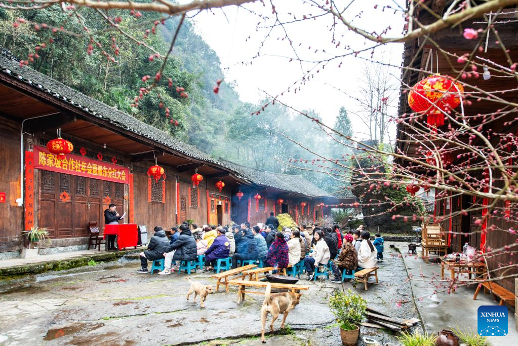 Villagers attend a shareholder meeting of the cooperatives in Chenjiapo Village of Yongshun County, central China's Hunan Province, Jan. 29, 2022 (Photo by Yu Guanglong/Xinhua)