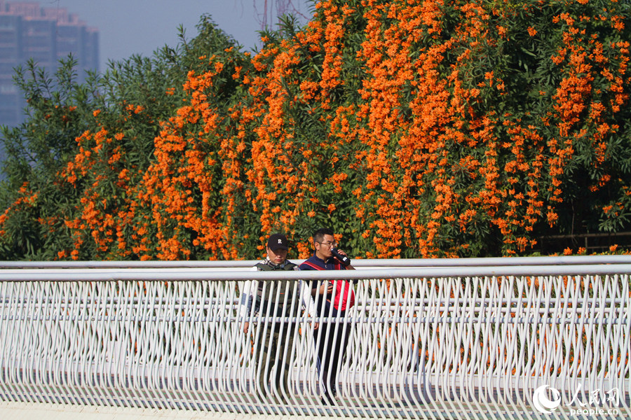 Photo shows blooming orange trumpet vines beside a footpath in Xiamen, southeast China’s Fujian Province. (People’s Daily Online/Chen Bo)