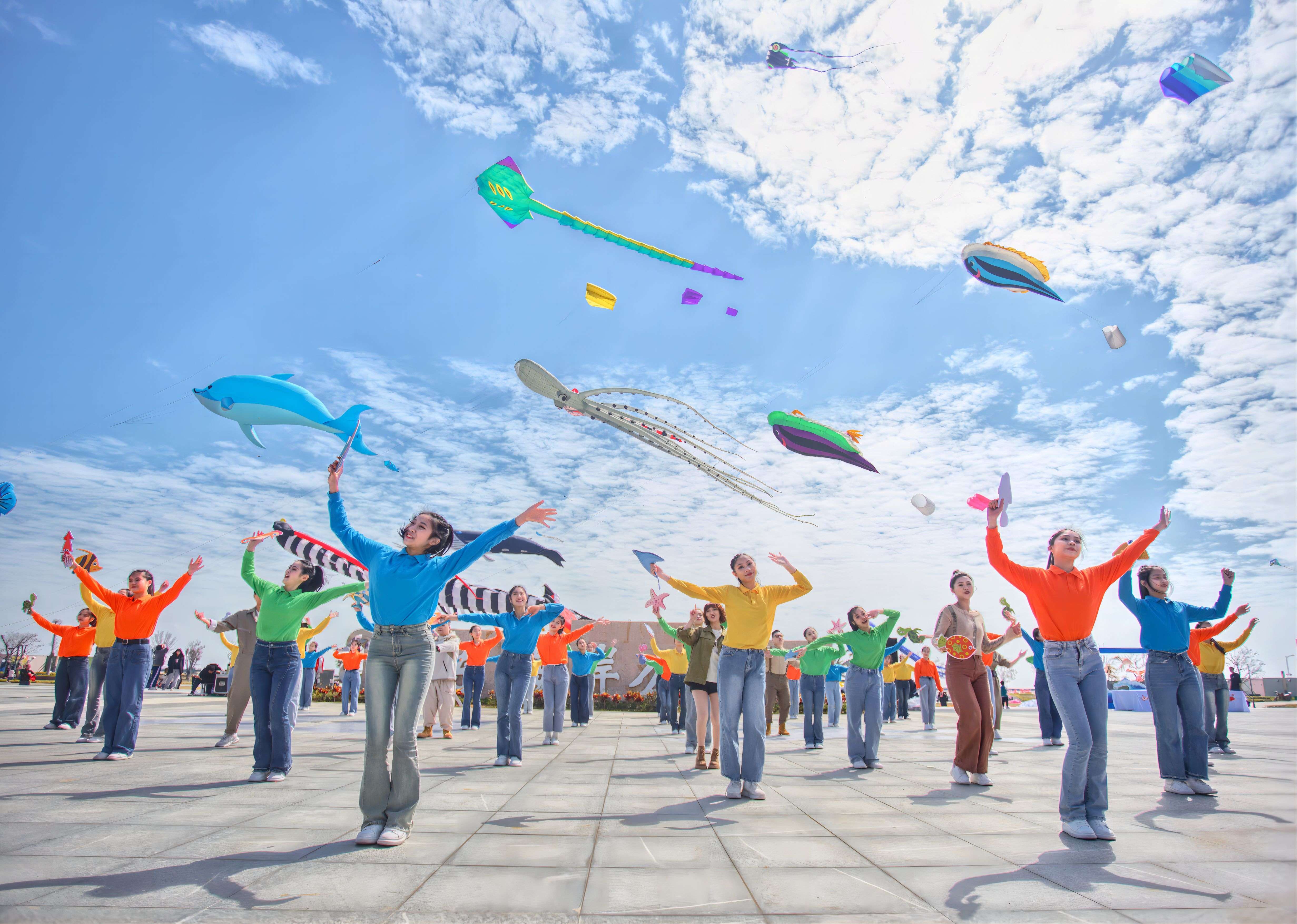 A blaze of kites in the shape of sea life, such as dolphins, whales, and octopuses, flew in the air. Under the sky, tourists posed for pictures against the colorful background and strolled or jogged on the lawn, while teenagers danced with vigor and vitality to greet spring.