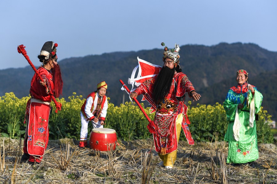 A troupe of Dong Opera has a rehearsal in a field in Tianzhu County, southwest China's Guizhou Province, Feb. 26, 2023. (Xinhua/Yang Wenbin)