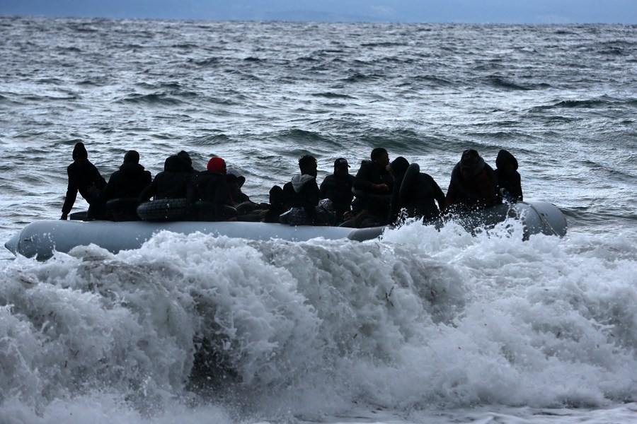 A boat with refugees and migrants arrives at Skala Sikaminias, on the Greek island of Lesbos, Greece, Feb. 29, 2020. (Xinhua/Marios Lolos)