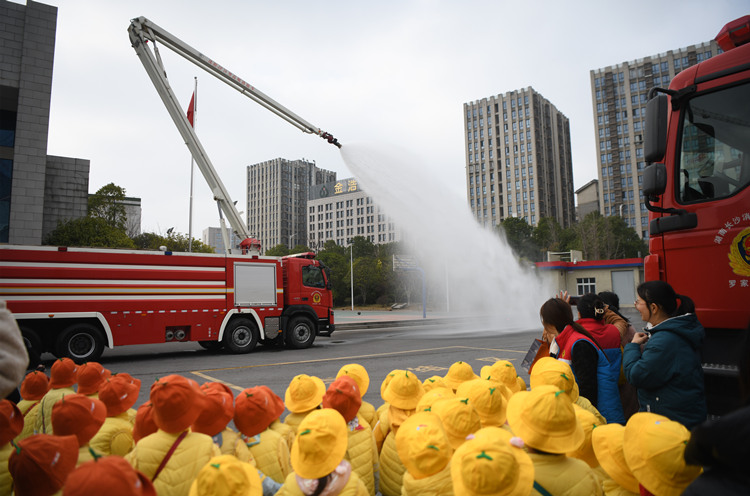 Firefighters demonstrate how to extinguish a fire at a fire station in Tianxin district, Changsha, central China’s Hunan Province. (Photo courtesy of Hunan provincial fire and rescue team)