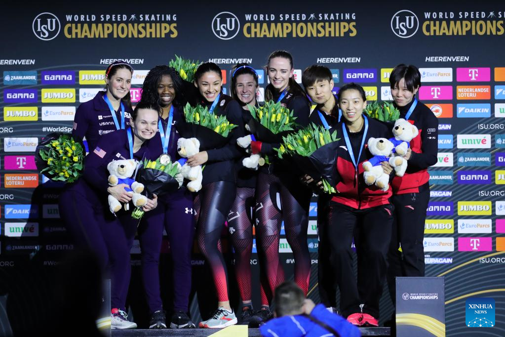 Gold medalist team Canada (C), silver medalist team USA (L) and bronze medalist team China pose for photos during the awarding ceremony after women's team sprint on the Day 1 of the ISU World Speed Skating Championships in Heerenveen, the Netherlands, March 2, 2023. (Xinhua/Zheng Huansong)