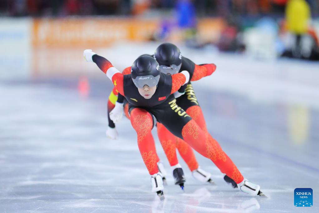 Yang Binyu of China competes during women's 3000m on the Day 1 of the ISU World Speed Skating Championships in Heerenveen, the Netherlands, March 2, 2023. (Xinhua/Zheng Huansong)