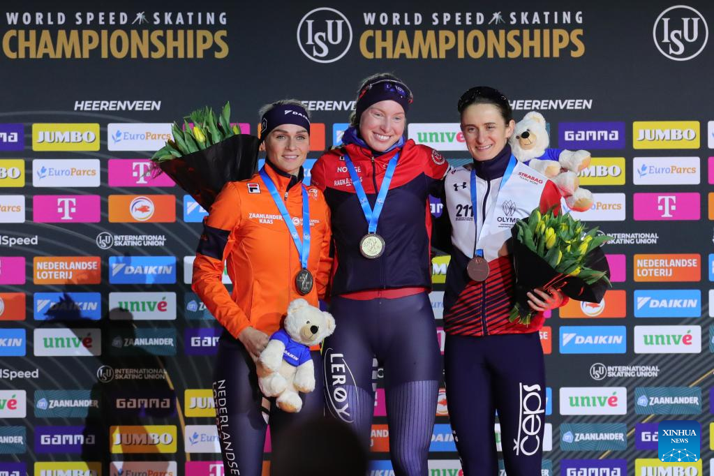 Gold medalist Ragne Wiklund (C) of Norway, silver medalist Irene Schouten of the Netherlands (L) and bronze medalist Martina Sablikova of the Czech Republic pose for photos during the awarding ceremony for women's 3000m on the Day 1 of the ISU World Speed Skating Championships in Heerenveen, the Netherlands, March 2, 2023. (Xinhua/Zheng Huansong)