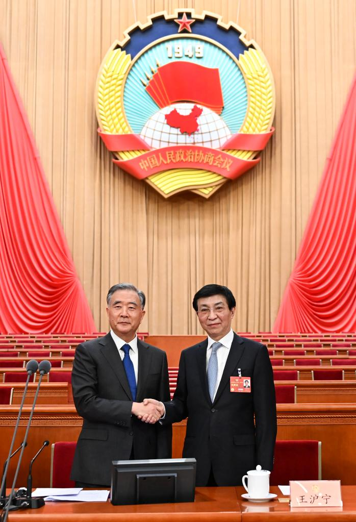 Wang Yang, chairman of the 13th National Committee of the Chinese People's Political Consultative Conference (CPPCC), shakes hands with Wang Huning, who presides over a presidium meeting of the first session of the 14th CPPCC National Committee, during a preparatory meeting for the first session of the 14th CPPCC National Committee at the Great Hall of the People in Beijing, capital of China, March 3, 2023. (Xinhua/Xie Huanchi)
