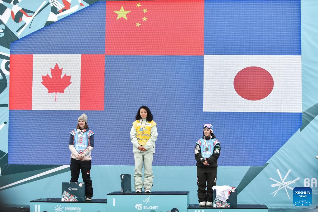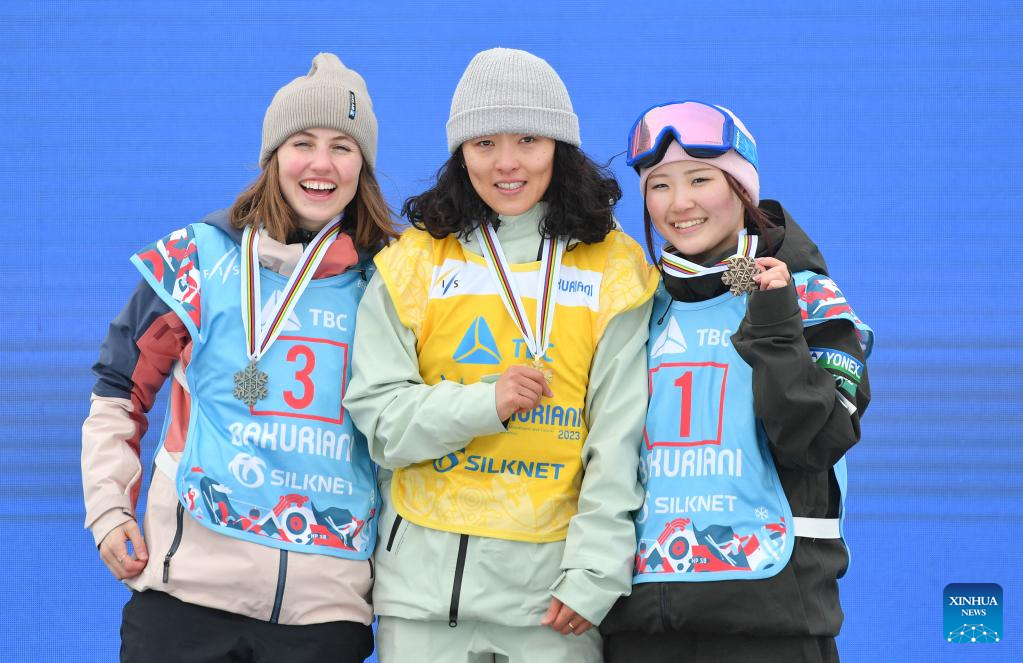 Gold medalist Cai Xuetong (C) of China, silver medalist Elizabeth Hosking (L) of Canada and bronze medalist Ono Mitsuki of Japan attend the awarding ceremony after the women's halfpipe final at the FIS Snowboard World Championships in Bakuriani, Georgia, March 3, 2023. (Photo by Tamuna Kulumbegashvili/Xinhua)