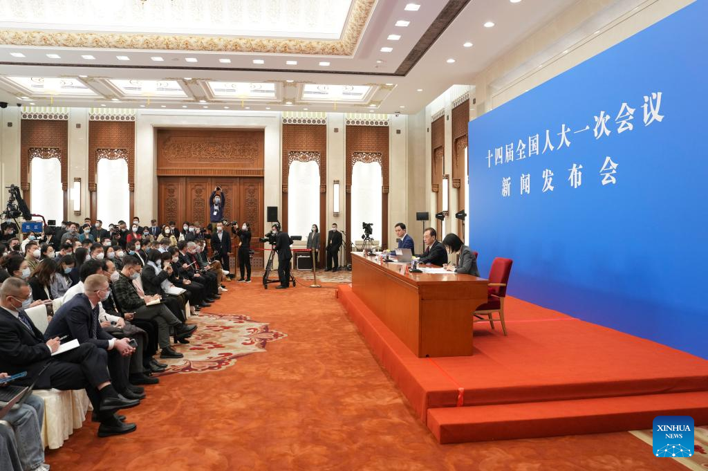 Wang Chao (C), spokesperson for the first session of the 14th National People's Congress (NPC), attends a press conference at the Great Hall of the People in Beijing, capital of China, March 4, 2023. The NPC, China's national legislature, held a press conference Saturday, one day before the opening of its annual session. (Xinhua/Cai Yang)