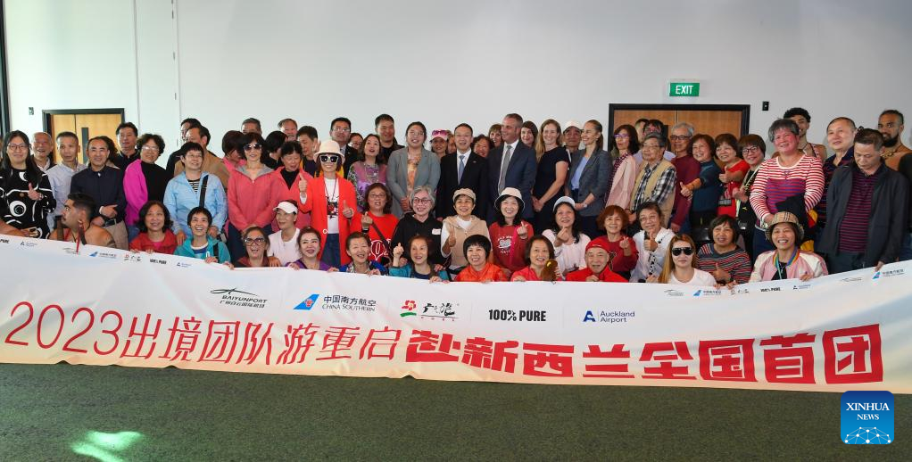 Chinese tourists take part in a welcome ceremony at the Auckland Airport in Auckland, New Zealand, March 3, 2023. (Xinhua/Guo Lei)