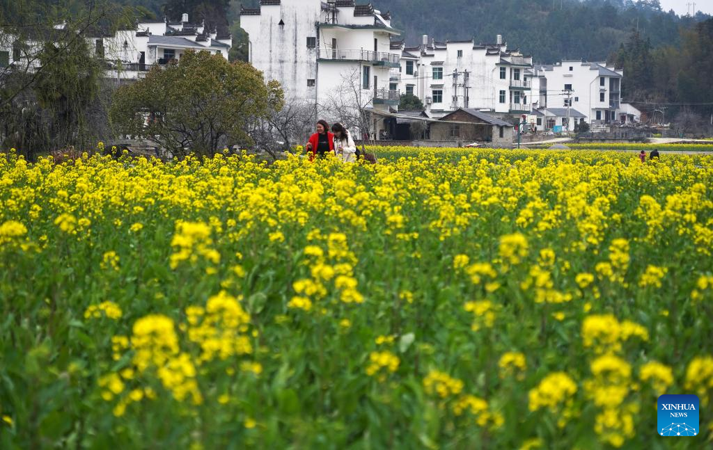 People enjoy flowers at a scenic spot in Wuyuan County of east China's Jiangxi Province, March 3, 2023. Spring scenery in Wuyuan attracts lots of visitors with the rising of temperature. (Xinhua/Wan Xiang)
