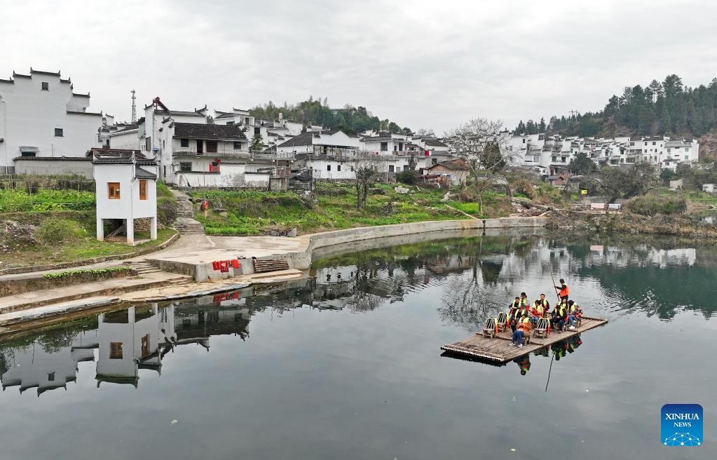 Tourists take a bamboo raft in Qinghua Township, Wuyuan County of east China's Jiangxi Province, March 3, 2023. Spring scenery in Wuyuan attracts lots of visitors with the rising of temperature. (Xinhua/Wan Xiang)