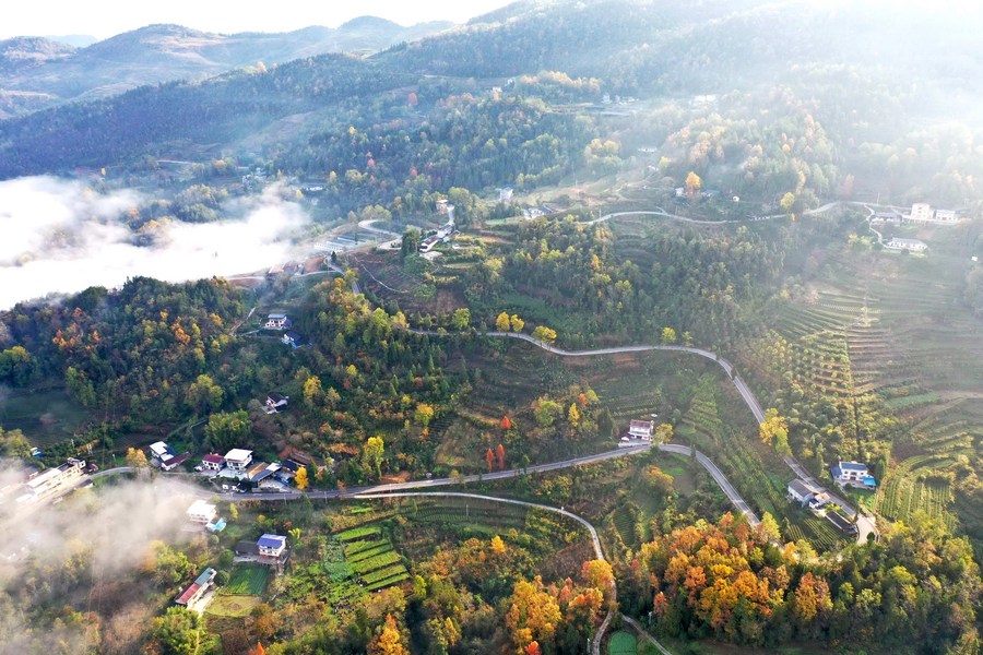 This aerial photo taken on Nov. 25, 2022 shows country roads leading to Dongmenguan Village winding on mountains in Zhushan Township in Xuan'en County, central China's Hubei Province. (Photo by Song Wen/Xinhua)