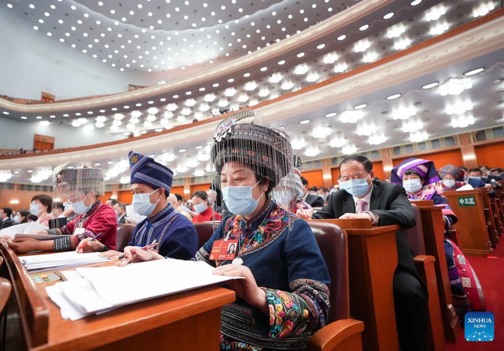 Deputies attend the opening meeting of the first session of the 14th National People's Congress (NPC) at the Great Hall of the People in Beijing, capital of China, March 5, 2023. (Xinhua/Yan Yan)