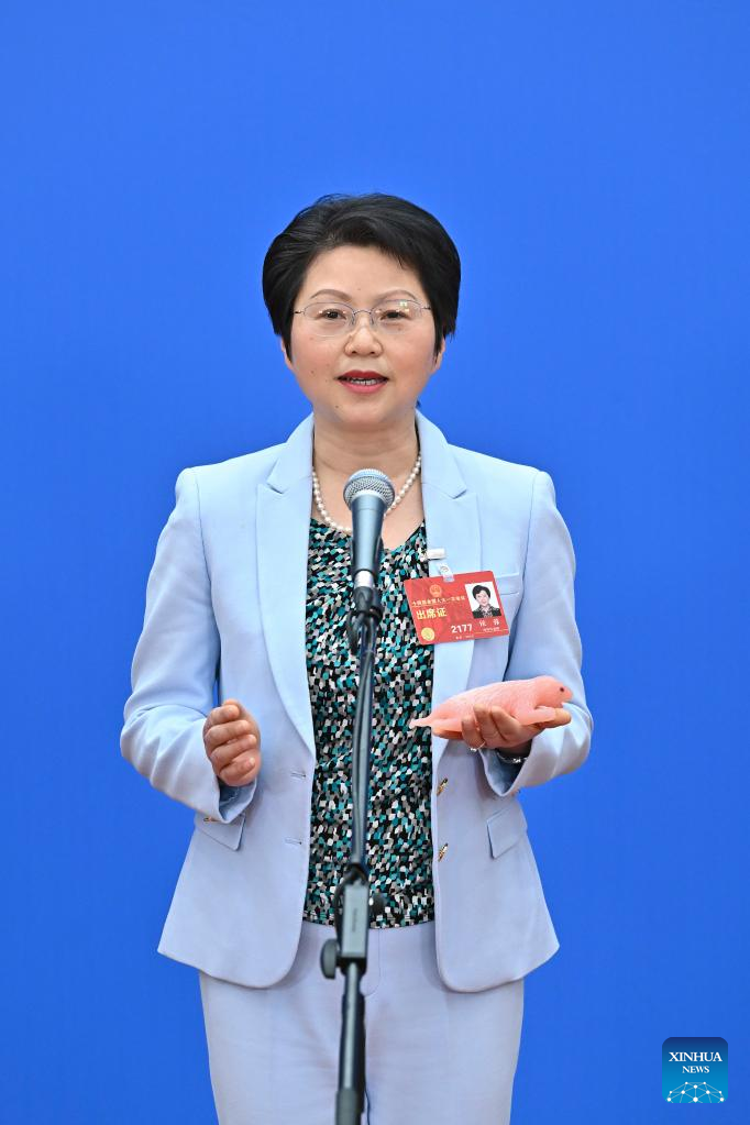 Shui Qingxia, a deputy to the 14th National People's Congress (NPC), attends an interview ahead of the opening meeting of the first session of the 14th NPC in Beijing, capital of China, March 5, 2023. (Xinhua/Liu Jinhai)