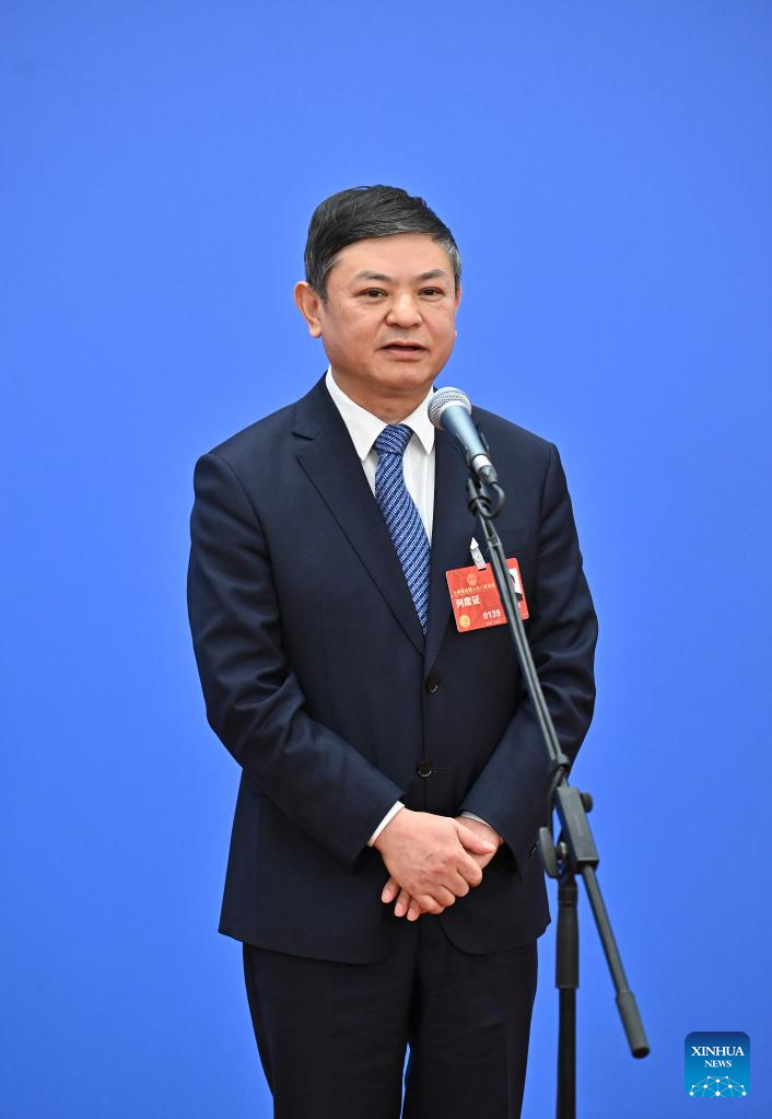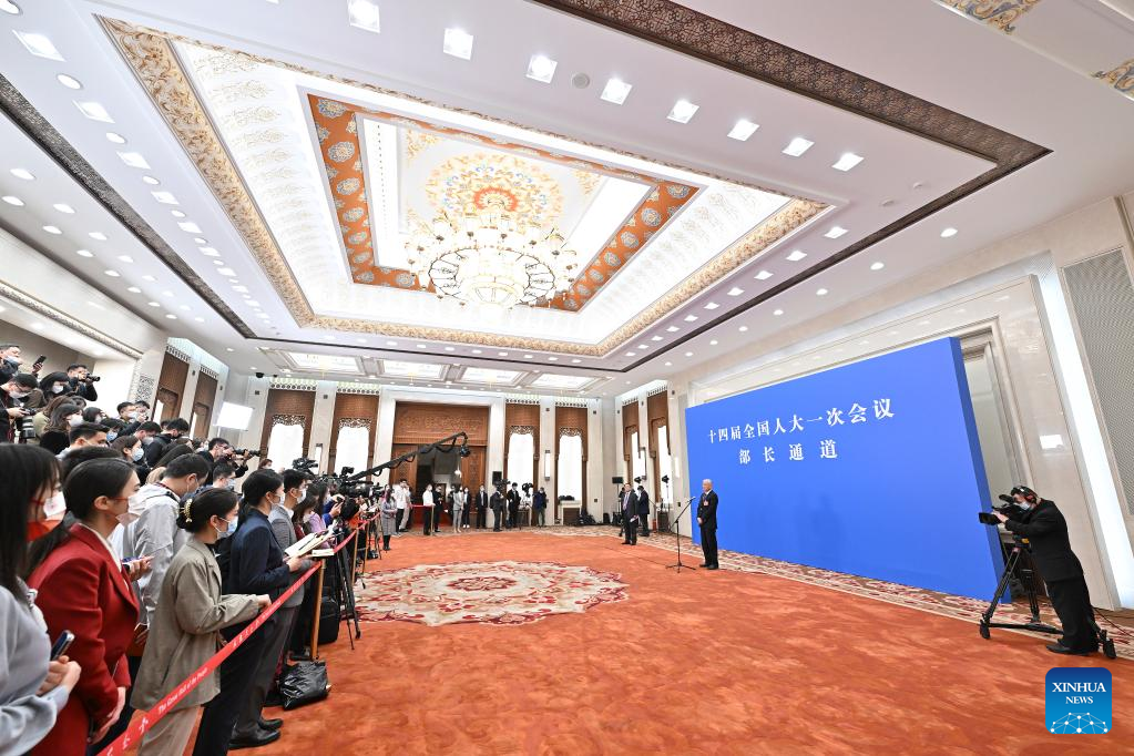 Minister of Industry and Information Technology Jin Zhuanglong gives an interview after the opening meeting of the first session of the 14th National People's Congress (NPC) in Beijing, capital of China, March 5, 2023. (Xinhua/Liu Jinhai)