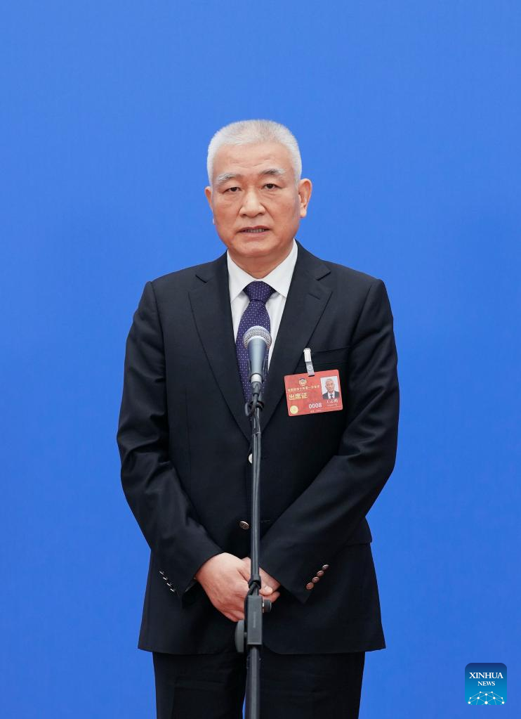 Minister of Ecology and Environment Huang Runqiu gives an interview after the opening meeting of the first session of the 14th National People's Congress (NPC) in Beijing, capital of China, March 5, 2023. (Xinhua/Liu Jinhai)