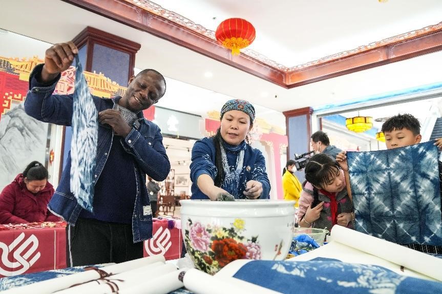 A foreigner and Chinese children learn traditional Chinese tie-dye techniques under the guidance of a craftswoman in Licang district, Qingdao, east China's Shandong province, Feb. 24, 2023. (Photo by Zhang Ying/People's Daily Online)