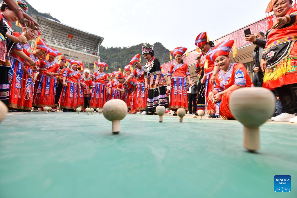 Women take part in a spinning top competition to celebrate the upcoming International Women's Day in Renliang Village of Dahua Yao Autonomous County, south China's Guangxi Zhuang Autonomous Region, March 5, 2023. (Xinhua/Huang Xiaobang)