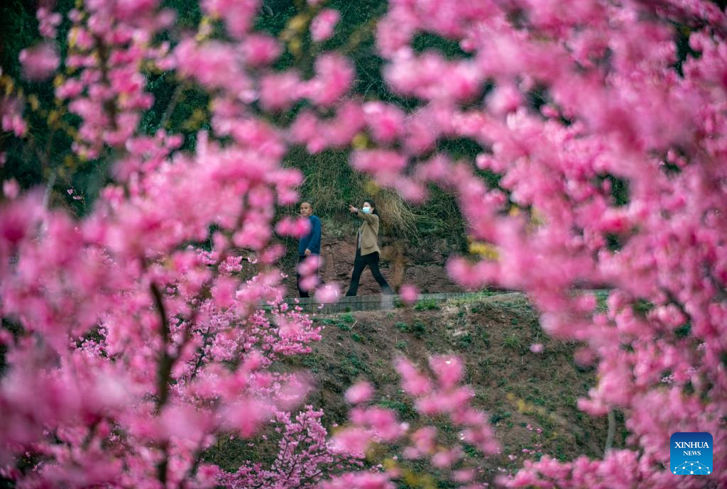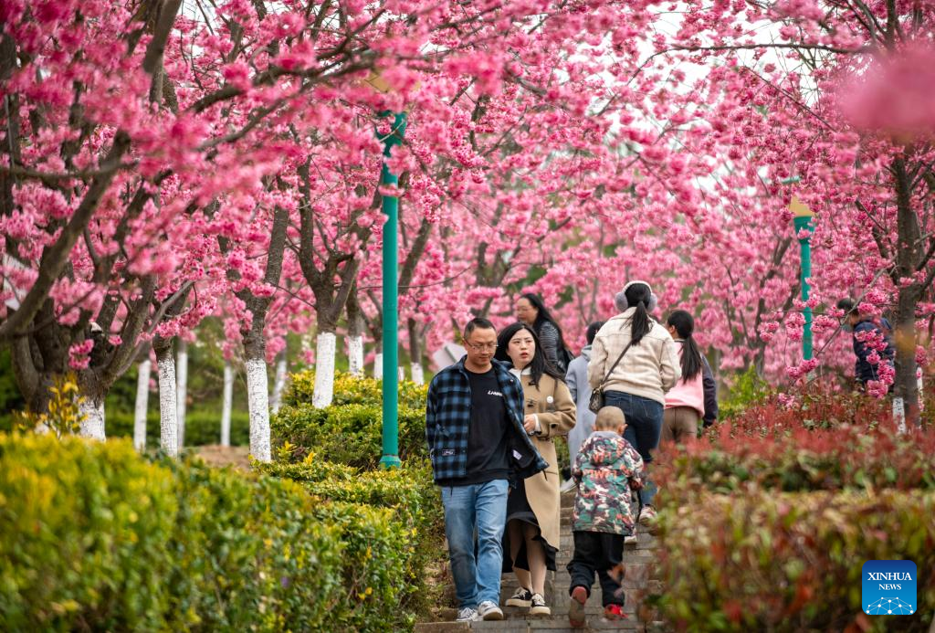 Tourists visit a scenic area which features over 400 mu (about 26.7 hectares) of cherry blossoms in Malong District of Qujing City, southwest China's Yunnan Province, March 5, 2023. (Xinhua/Chen Xinbo)