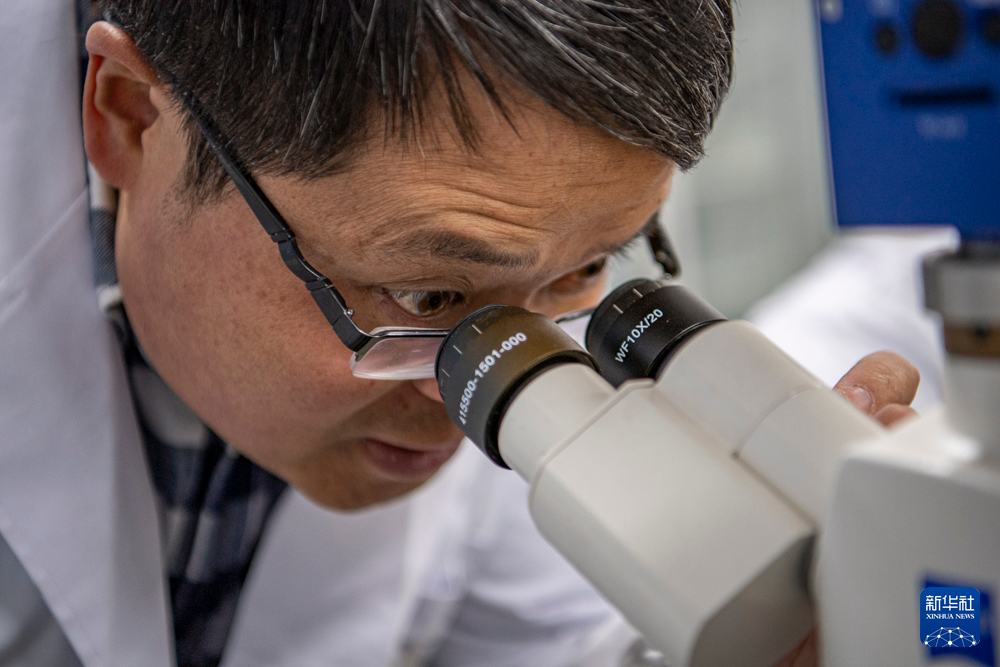 Yang Le observes animal samples with microscope in a laboratory of the Tibet Plateau Institute of Biology in Lhasa, southwest China's Tibet Autonomous Region, March 2, 2023. (Xinhua/Sun Fei)