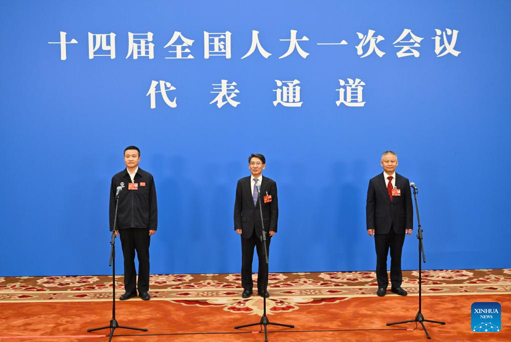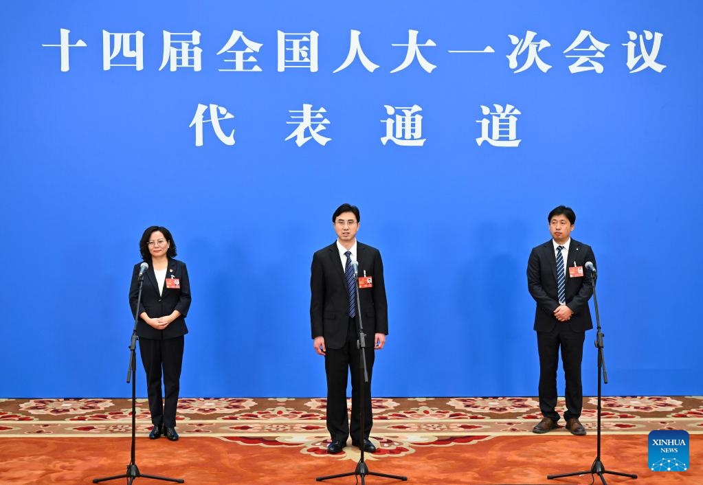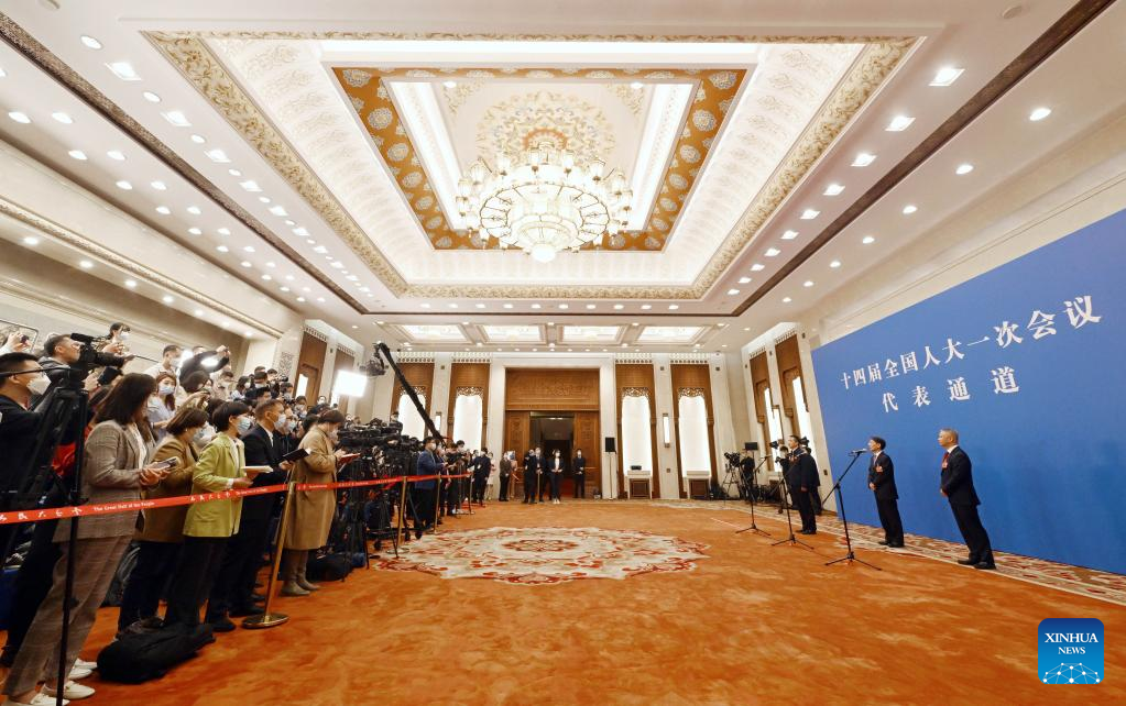 Deputies to the 14th National People's Congress (NPC) are interviewed ahead of the second plenary meeting of the first session of the 14th NPC in Beijing, capital of China, March 7, 2023. (Xinhua/Li Xin)