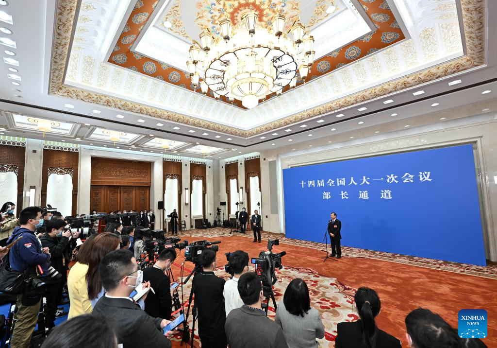 Minister of Emergency Management Wang Xiangxi gives an interview after the second plenary meeting of the first session of the 14th National People's Congress (NPC) in Beijing, capital of China, March 7, 2023. (Xinhua/Wang Yuguo)