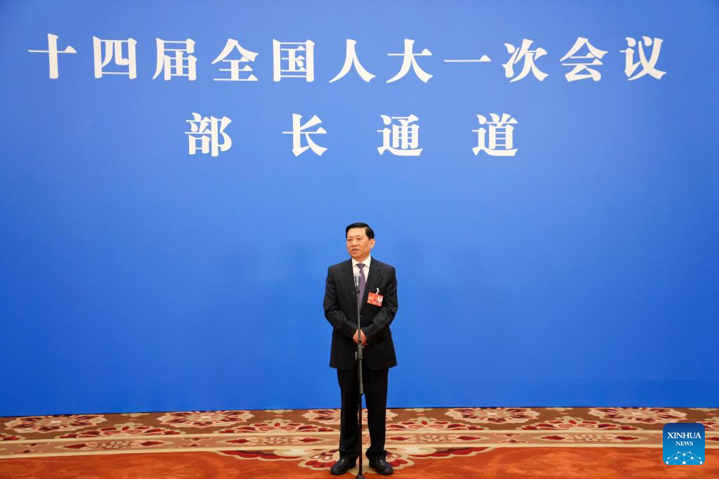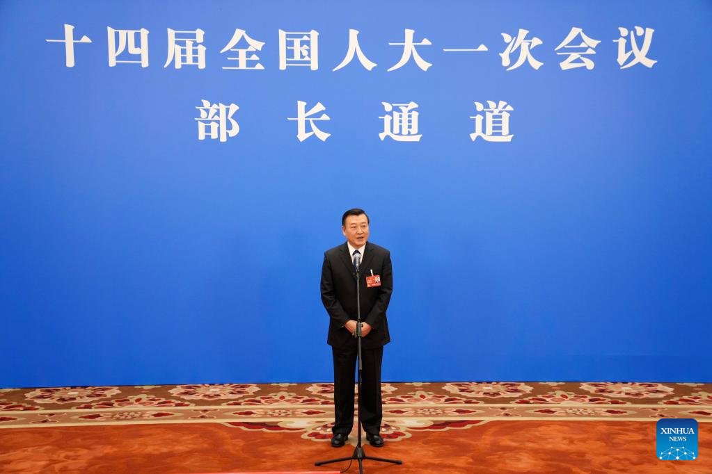 Minister of Housing and Urban-Rural Development Ni Hong gives an interview after the second plenary meeting of the first session of the 14th National People's Congress (NPC) in Beijing, capital of China, March 7, 2023. (Xinhua/Liu Jinhai)