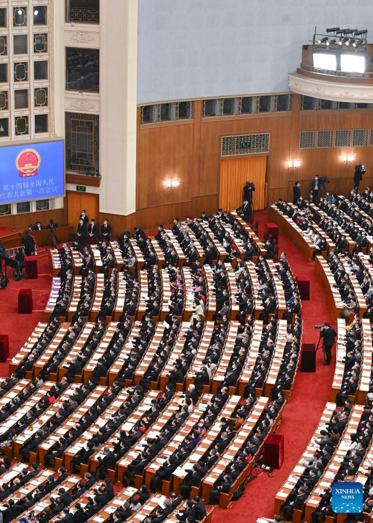 BEIJING, March 7 (Xinhua) -- The first session of the 14th National People's Congress (NPC) held a plenary meeting Tuesday to hear work reports of the Standing Committee of the 13th NPC, the Supreme People's Court (SPC) and the Supreme People's Procuratorate (SPP), as well as an explanation on a reform plan of the State Council institutions.