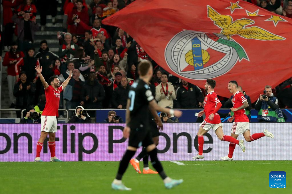 Players of Benfica celebrate scoring during the UEFA Champions League round of 16 second Leg football match between SL Benfica and Club Brugge at the Luz stadium in Lisbon, Portugal on March 7, 2023. (Photo by Pedro Fiuza/Xinhua)