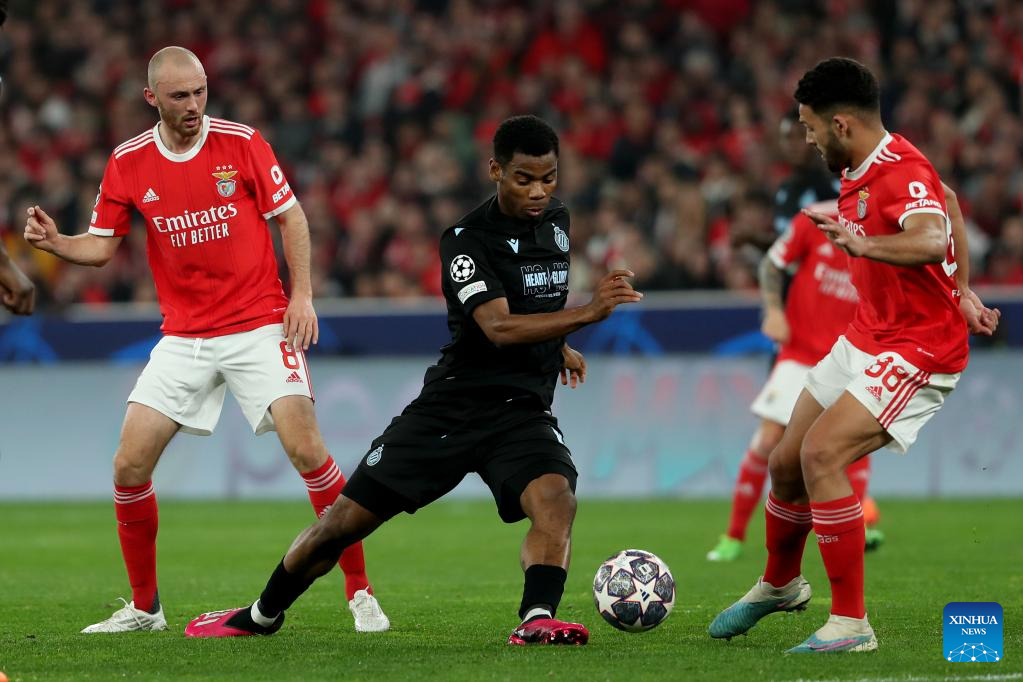 Kamal Sowah (C) of Club Brugge vies with Goncalo Ramos (R) of Benfica during the UEFA Champions League round of 16 second Leg football match between SL Benfica and Club Brugge at the Luz stadium in Lisbon, Portugal on March 7, 2023. (Photo by Pedro Fiuza/Xinhua)