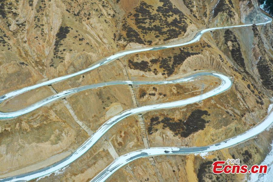 Duku highway, one of China's most dramatic roads, snakes through a snow-covered mountain in northwest China's Xinjiang Uygur Autonomous Region in March. (Photo: China News Service/Hu Renjie)